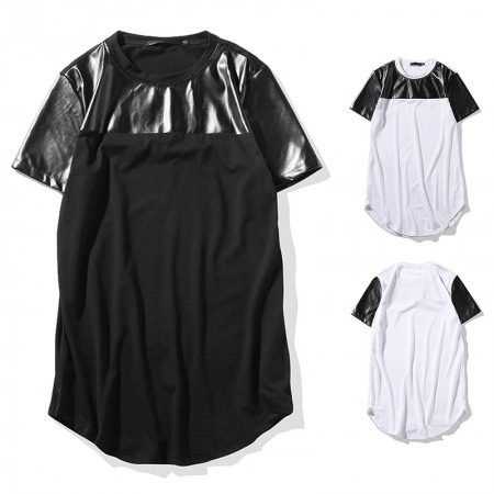 Flat Summer New Men's Round Neck Short-Sleeved High Street Arc Hem Solid Color Leather T-Shirt