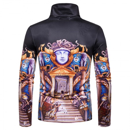 New Men's Large Size 3D Retro Castle Print High Neck Long Sleeve T-Shirt Bottoming Shirt